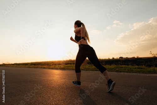 Young sporty girl running on a road at sunset. Lifestyle sports motivation.