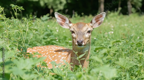 nature, cervid, wildlife, grass, no one, wild, outdoors, animal, wood, mammal, cute, little, summer, fawn, young, meadow, field, fur, antler, white tail, baby, countryside, curiosity, rural, park, head, looking, alert, leaf, barbaric, meadow, spotted, serene, forest, flora, peaceful, grazing