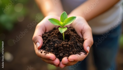 Young sprout held cupped hands, soil. Green plant grows in hands. Gardening, planting, nurturing, care, nature, ecology concept. Eco-friendly, organic, sustainable living, environment, earth day.