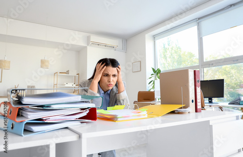 Young stressed businesswoman working with documents in office