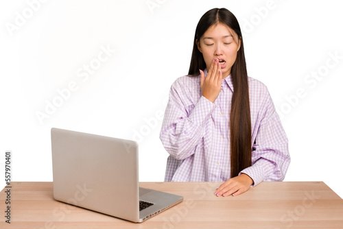 Young student asian woman in a workplace with a laptop isolated yawning showing a tired gesture covering mouth with hand.