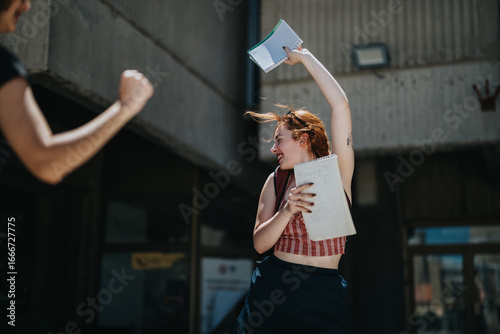 student, outdoors, celebration, book, learning, teamwork, youth, education, university, motivation, energy, happy, dynamic, urban, activity, group, friends, achievement, excitement, public, success, campus, remote, back to school, happiness, classmate, outside, courtyard