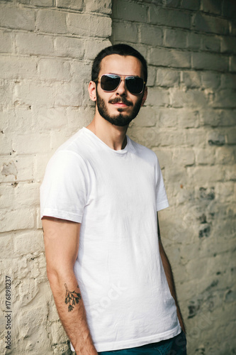 background, beard, blank, bristle, casual attire, citizen, closeup, clothes, clothing, design, fashionable, front, goggles, guy, hipster, horizontal, inscription, logotype, look, male, man, mock, model, muscular, photo, portrait, shirt, space, store, street, style, stylish, t-shirt, tattoo, template, textile, trendy, t-shirt, up, urban, wear, white, young