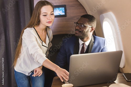 Young successful African-American businessman with glasses and an attractive female workmate blonde in a private jet. Service and flight first class