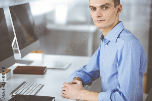 Young successful businessman works with computer, sitting at the desk in a modern office. Headshot of male entrepreneur or it-specialist at workplace. Business concept