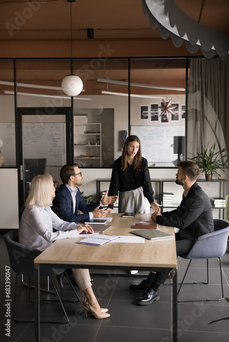 Young team manager woman talking to business colleagues at large meeting table, presenting project plan. Employees discussing collaboration, group tasks, working together