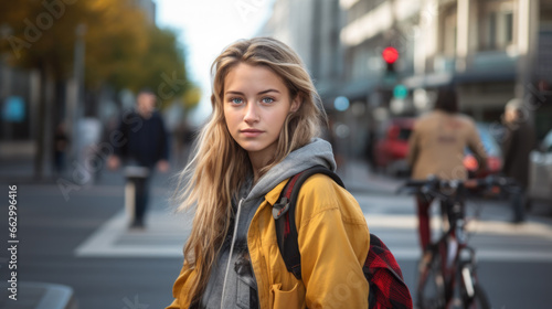 Young teenage girl walking in the city street.