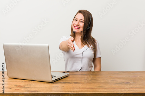 Young telemarketer woman stretching hand at camera in greeting gesture.