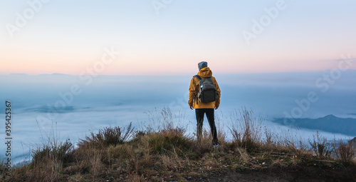 Young traveler man observing the landscape covered by a sea of fog on a beautiful sunrise. Rear view of adventurer backpacker in the top of the mountain. Concept of traveling, nature and freedom.