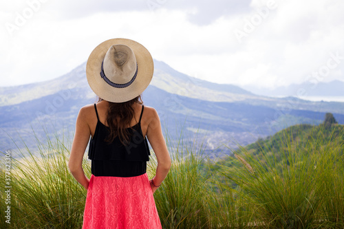 Young traveler woman wearing hat, enjoying mountain landscape. Hills and Batur volcano. Scenic panoramic view. Sky with white clouds. View from back. Kintamani, Bali