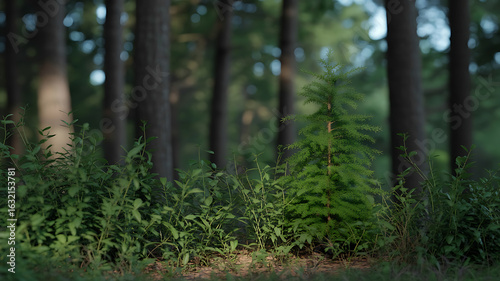 Young tree amidst a dense forest. Sunlight filters through the trees.