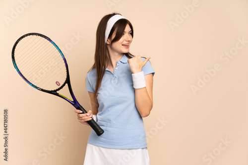 Young Ukrainian girl tennis player over isolated wall pointing to the side to present a product
