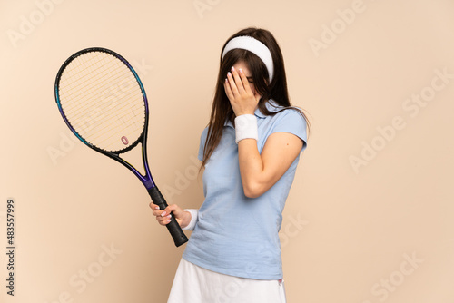 Young Ukrainian girl tennis player over isolated wall with tired and sick expression