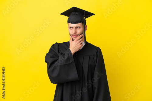 Young university graduate caucasian man isolated on yellow background having doubts and with confuse face expression