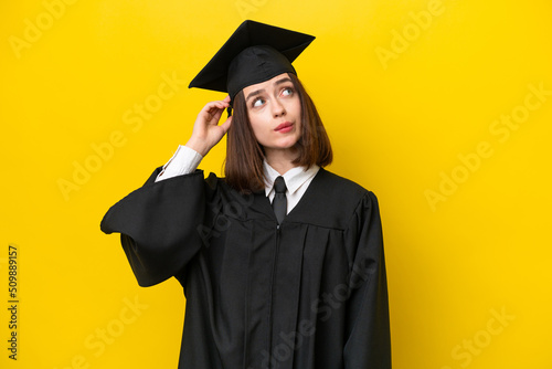 Young university graduate Ukrainian woman isolated on yellow background having doubts and with confuse face expression
