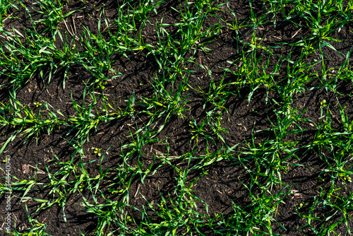 Young wheat seedlings grow in a field on a Sunny slope. Young green wheat grows from the soil in friendly rows
