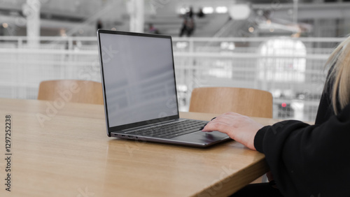 Young white woman working on computer with blank copy space screen on table in home office. close up female businesswoman hands typing text, surfing internet on modern laptop. mock up, front view