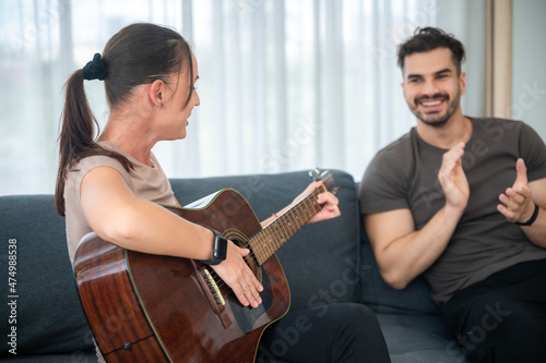 person, guitar, woman, couple, home, man, music, together, love, happy, indoor, sitting, female, fun, young, cheerful, lifestyle, playing, male, adult, girlfriend, play, togetherness, happiness, smiling, boyfriend, romantic, caucasian, beautiful, leisure, house, acoustic, girl, sofa, instrument, human relationships, romance, 2, guitarist, casual attire, apartment, musician, casual attire, human relationships, couch, enjoyment, friends, singing, family