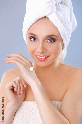 Young woman putting cream on her hand Isolated on gray background