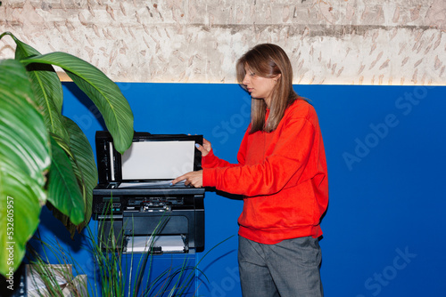 Young Woman Alone At Photocopier making copies at office