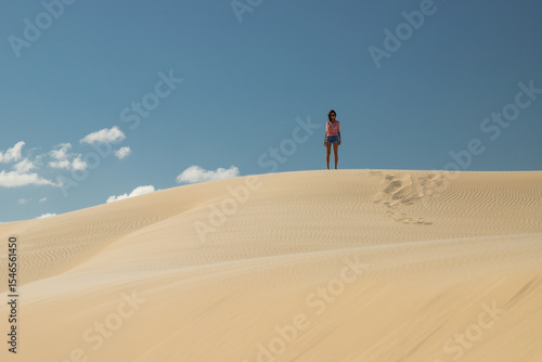 Young woman alone in desert sand dunes on sunny day with clouds in the sky