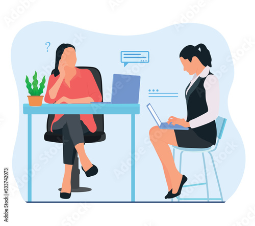 Young woman and girl sitting on the chair working with laptop in the table. Woman is thinking about developing business idea, vector flat style illustration.