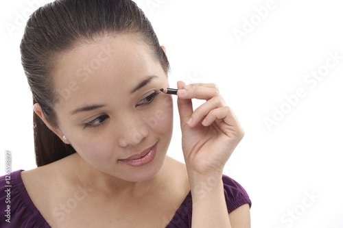 applying, asia, asian ethnicity, beauty, black hair, bodycare, cosmetic, eyeshadow, eyeliner, eyeshadow, grooming, head shot, holding, horizontal, indoor, looking away, make-up, one person, ponytail, portrait, preparation, smiling, straight hair, studio shot, vanity, woman, young adult, photo