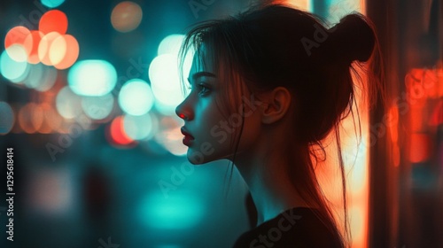 woman, night, city, light, bokeh, portrait, profile, moody, dark, urban, colourful, street, reflections, glow, vibrant, teal, orange, red, blue, green, nightlife, melancholy, mysterious, dreamy, atmospheric, city landscape, scene, evening, photo, female, side, wet, hair, bun, coiffure, close, up, emotional, contemplative, thoughtful, solitude, exploration, atmosphere