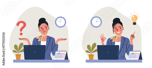 idea, laptop, puzzled, question mark, woman, ask, bubble, businessman, cartoon, character, choice, clock, computer, concept, confused, cute, deadline, desk, doubt, face, female, find, finger, flat, human, illustration, job, light bulb, looking, manager, mark, office, people, person, plan, plant, portrait, problem, question, solution, thinks, thoughtful, vector, work, men at work, workplace, young