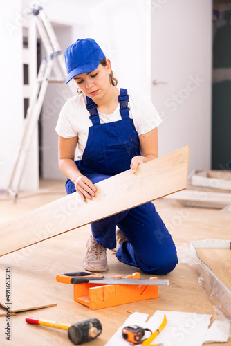 Young woman builder installing parquet in construction site.