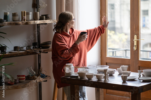Young woman ceramicist drinking tea or coffee at workplace in cozy pottery studio, sitting at work table and looking out window, happy female potter at ceramic workshop, enjoying working with clay