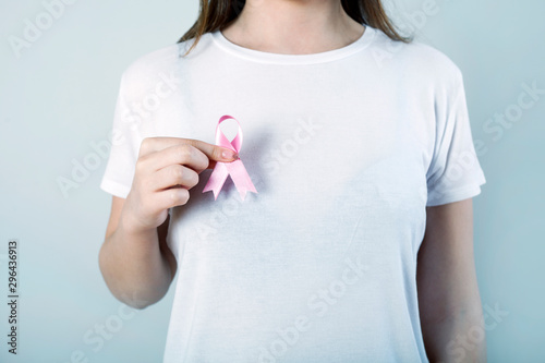 breast cancer, cancer, care, medicals, ribbon, pink, neurology, check up, control, woman, young, beautiful, isolated, white, beauty, happy, people, person, pregnancy, hand, holding, portrait, hand, casual attire, brunette, cute, 1, model, standing