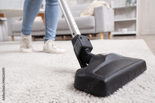 Young woman cleaning carpet with cordless stick vacuum cleaner in living room, closeup
