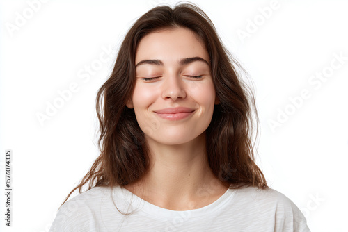 Young woman closed eyes smiling face long brown hair white shirt isolated background peaceful expression natural beauty female portrait happiness