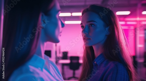 young woman communicating with colleague in office environment artificial lighting