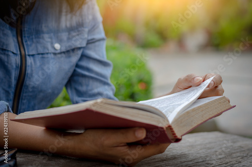 Young woman concentrate on reading book with garden background in free time. Knowledge concept.