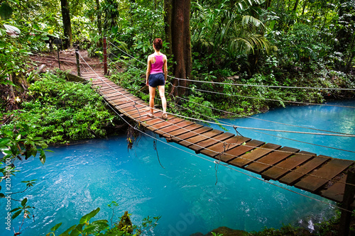 Young woman crossing a hanging bridge in the Jungle of Costa Rica. The river (rio celeste in tenorio national park close to Bijagua) has an emerald green color, caused by volcanic minerals