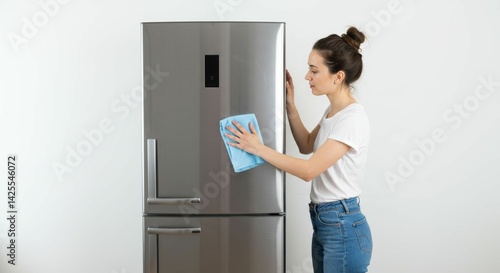 cleaning, refrigerator, woman, stainless, steel, clean, appliance, wipe, housework, domestic, chore, young, female, home, hygiene, modern, kitchen, towel, surface, household, routine, upkeep, sparkling, fresh, gleaming, spotless, pristine, tidiness, meticulous, sanitary, polish, wiping, lifestyle, minimalism, background, indoor, care, cleanliness, neatness, well-being