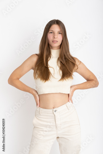 Young Woman dressing white on photo studio shooting - Confidence