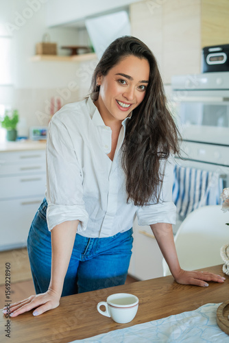 horizontal, indoor, lifestyle, one person, photo, relaxation, sofa, young adult, copy space, cosy, people, beautiful woman, brown hair, drinking, adult, domestic life, avocation, missy, adults only, carefree, contemplation, enjoyment, female, woman, coffee cup, color image, happiness, morning, mug, beauty, cup, comfortable, living room, standing, window, looking, sitting, smiling, holding, home interior