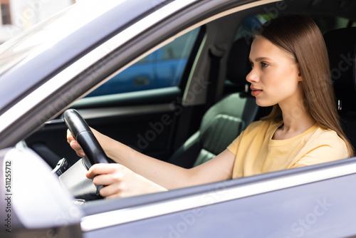 Young woman driver sitting in car on the street