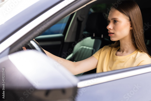 Young woman driving a car in the city. Portrait of a beautiful woman in a car, looking out of the window and smiling. Travel and vacations concepts