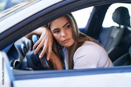 young, woman, female, hispanic, adult, person, beautiful, attractive, face, coiffure, looking, cool, lifestyle, expression, sitting, belt, seat, sunlight, fashion, car, vehicle, transport, auto, insurance, drive, driver, driving, serious, condensed, concentration, sleepy, boring, relaxed, street, town, city, urban, road, outdoors, outside, exterior, background