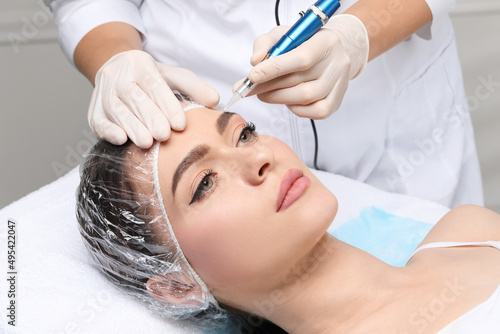 Young woman during procedure of permanent eyebrow makeup in beauty salon, closeup