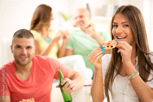 friends, home, party, pizza, eating, fun, cheerful, smiling, happy, happiness, enjoyment, friendship, entertainment, young, man, woman, couple, lifestyle, boy, girl, four people, caucasian, sitting, together, closeup, indoor, horizontal