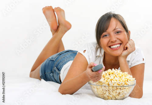 popcorn, woman, eating, remote control, young, snack, female, smile, food, toothy smile