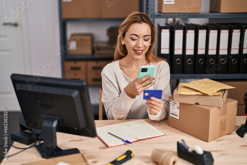 Young woman ecommerce busines worker using smartphone and credit card at office