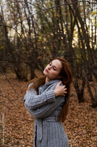 young, woman, embracing, herself, autumn, forest, peaceful, mood, stand, serene, timberland, red-haired, female, light, grey, cardigan, eye, closed, contentment, soft, filter, through, bare, tree, people, young adult, one person, relaxation, photo, calmness, woman, happiness, horizontal, lifestyle, enjoyment, friendship, togetherness, smiling, freedom, vertical, pet, meditating, idea, ranch, mare, horse, stable