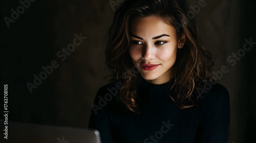 woman, laptop, screen, focused, digital, light, dark, indoor, atmospheric, female, person, face, portrait, human, beauty, young, adult, model, smile, expression, eye, hair, make-up, lip, computer, working, reading, browsing, technology, device, online, communication, information, datum, thoughtful, contemplative, interested, curious, happy, serene, calm, quiet, shadow, illumination, mood, atmosphere, solitude