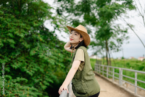 asian, activity, adventure, beauty, bright, casual attire, casual clothes, countryside, cowboy hat, day, enjoyment, environment, exploration, exploring, feminine, freshness, green, happiness, hiking, joy, joyfulness, landscape, leisure, lifestyle, natural beauty, nature, path, posing, positive, relaxation, scenery, scenic view, serene, smiling, summer, sun, calmness, tree, walking, woman, youthful